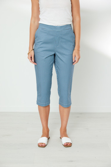 Wide double button fly front with elasticated back waistband. 7/8th length. Front pockets with scalloped lace trim edge. Mock back pockets. 70% Viscose 30% Nylon. Colour Sage